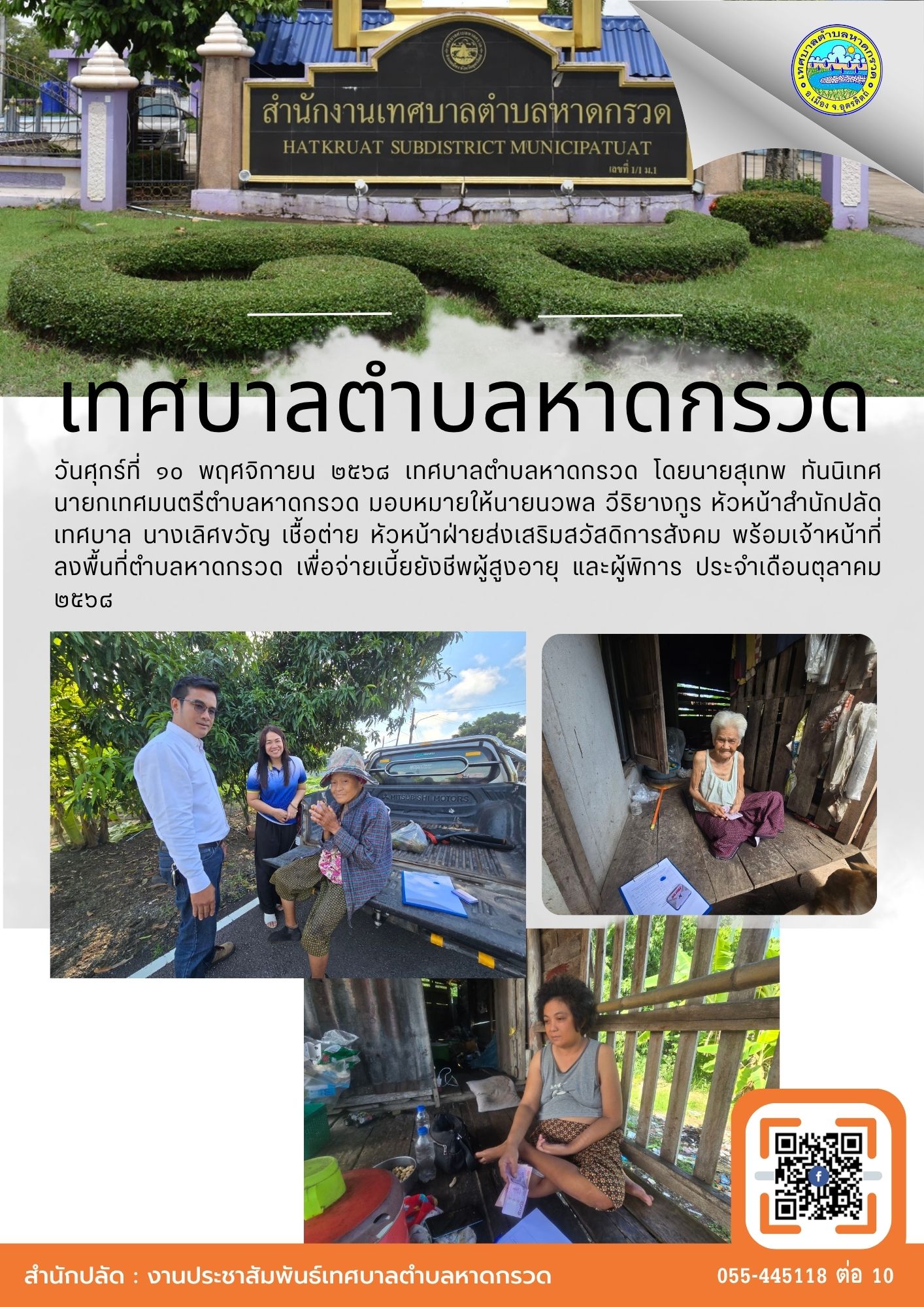 เมื่อช่วงเช้าวันศุกร์ที่ 10 พฤศจิกายน 2568 เจ้าหน้าที่ พนักงานเทศบาลตำบลหากรวดได้ลงพื้นที่ไปแจกเบี้ยยังชีพผู้สูงอายุ ประจำเดือนพฤศจิกายน 2568