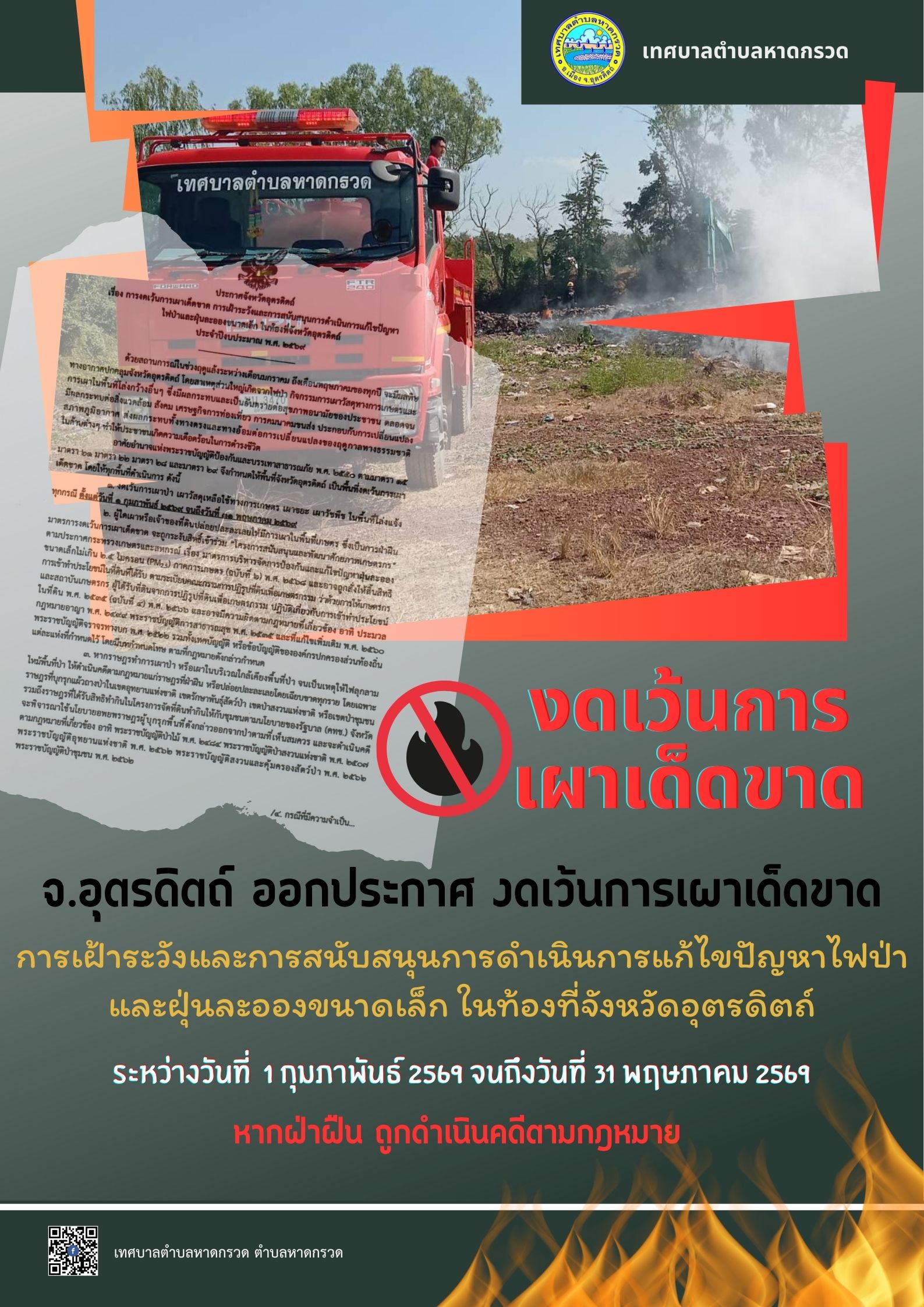 28/01/69 เรื่อง ประชาสัมพันธ์ งดเว้นการเผาเด็ดขาด ห้ามเผาป่า เผาวัสดุเหลือใช้ทางการเกษตร เผาขยะ และการเผาในพื้นที่โล่งแจ้งทุกกรณี ตั้งแต่วันที่ 1 กุมภาพันธ์ ถึง 31 พฤษภาคม 2569