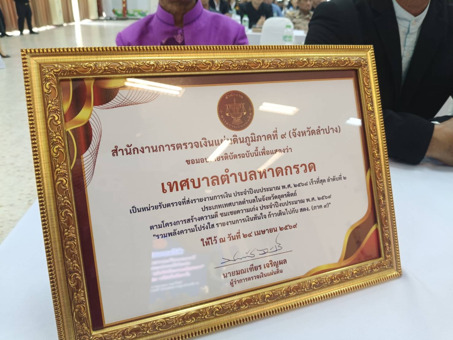 24/04/69 ร่วมพิธีรับเกียรติบัตร เป็นหน่วยรับตรวจที่ส่งรายงานการเงิน ประจำปีงบประมาณ 2568 เร็วที่สุด ลำดับที่ 2 ประเภทเทศบาลตำบลในจังหวัดอุตรดิตถ์