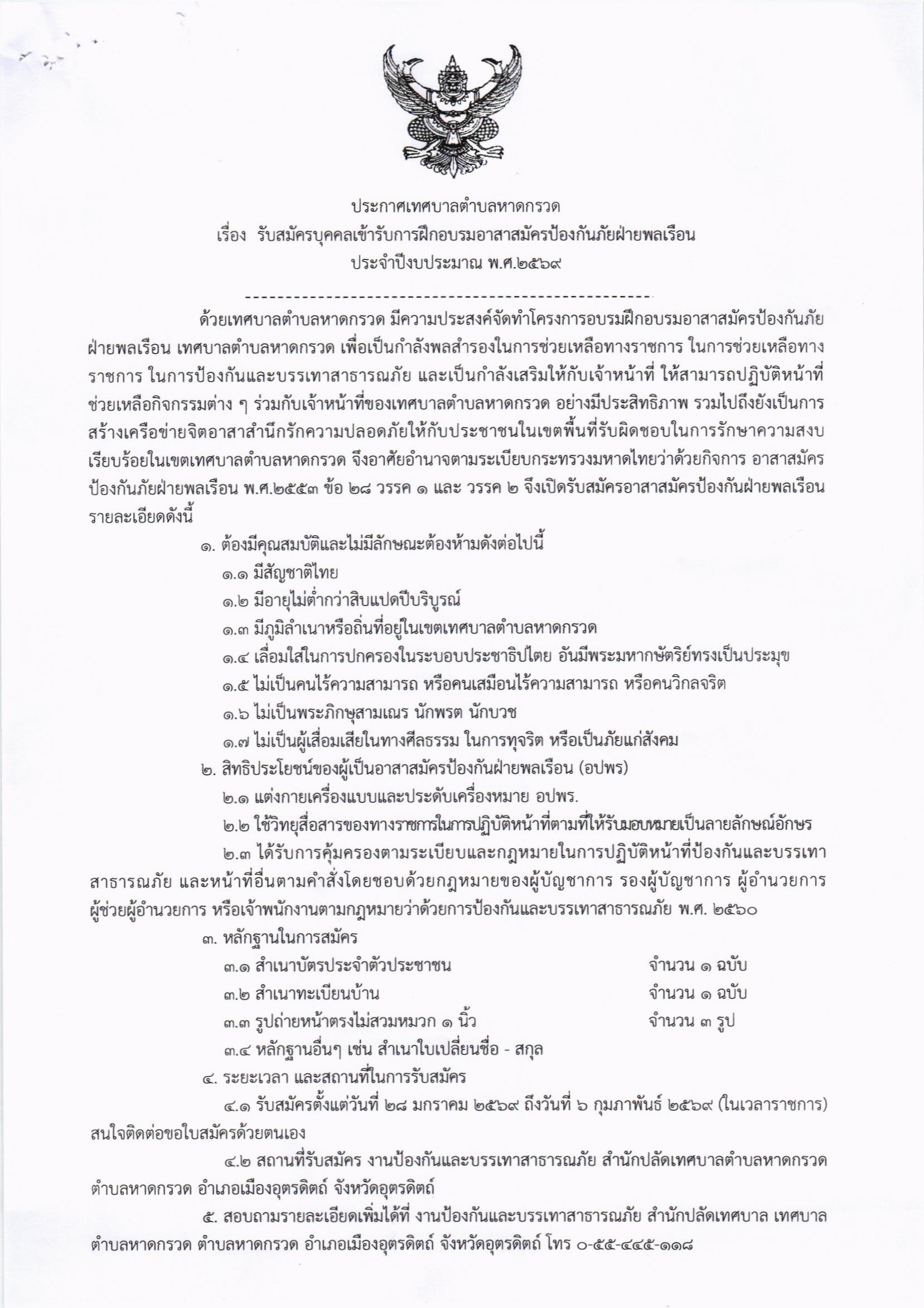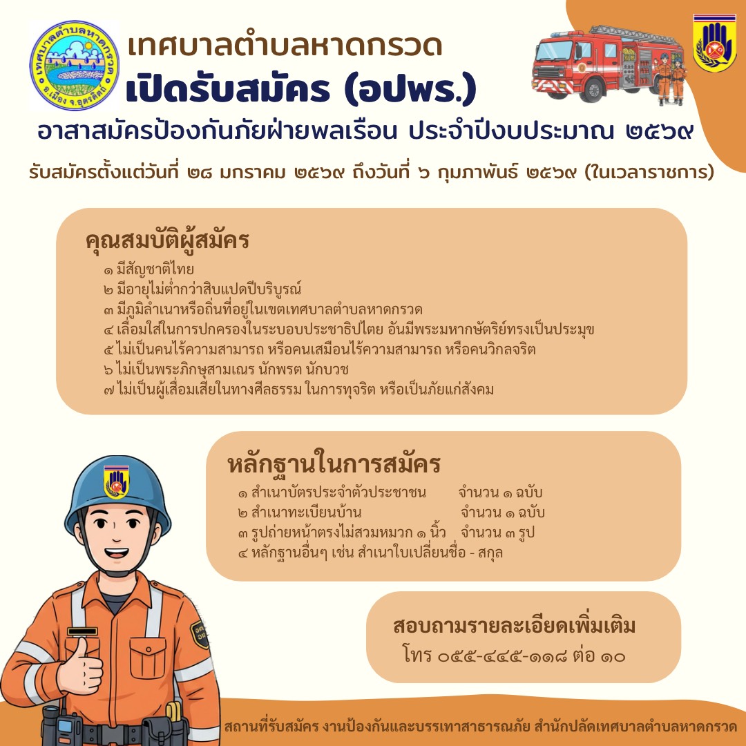 ประกาศรับสมัครสมาชิกอาสาสมัครป้องกันภัยฝ่ายพลเรือน (อปพร.) เทศบาลตำบลหาดกรวด ประจำปีงบประมาณ 2569